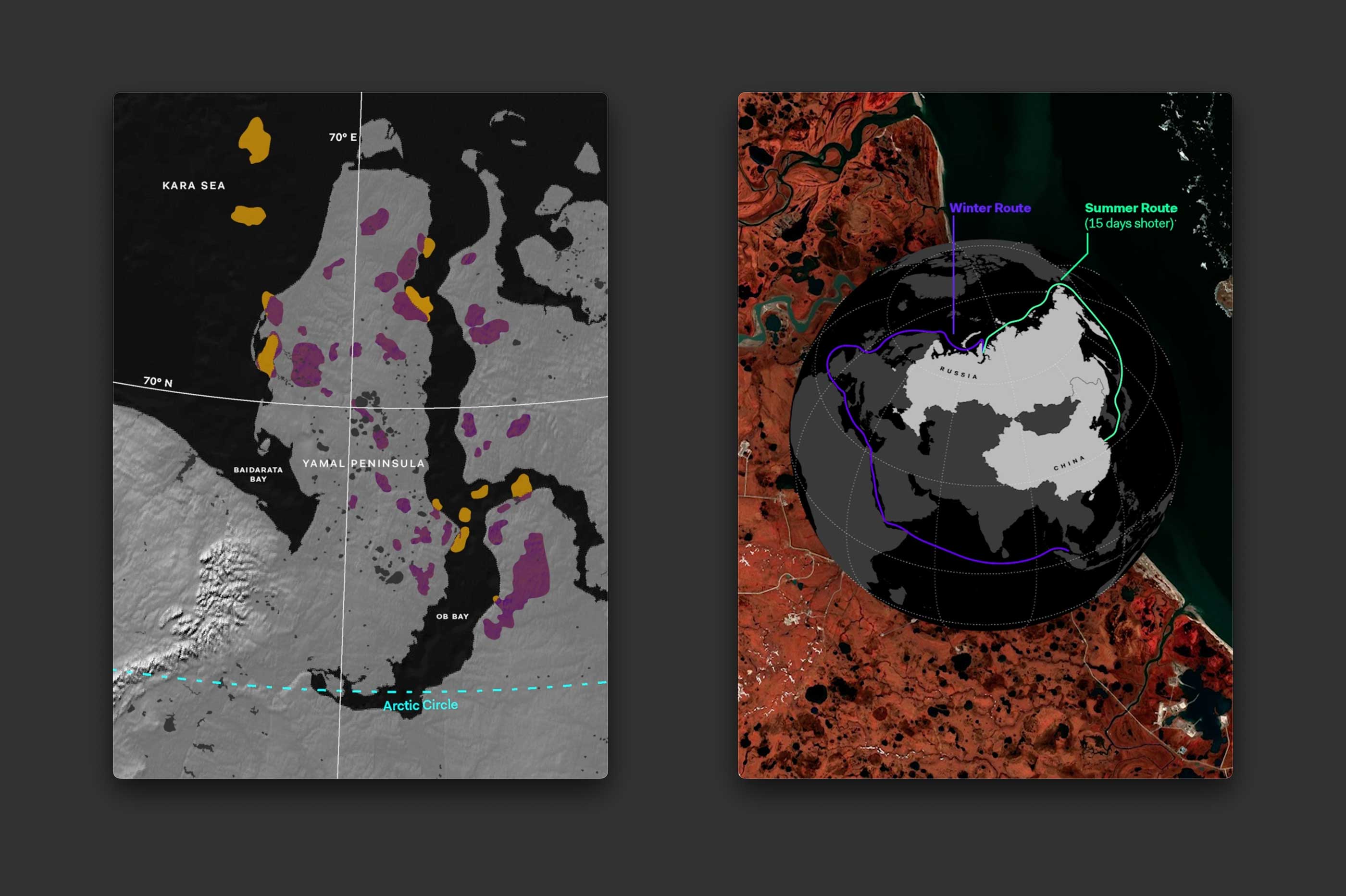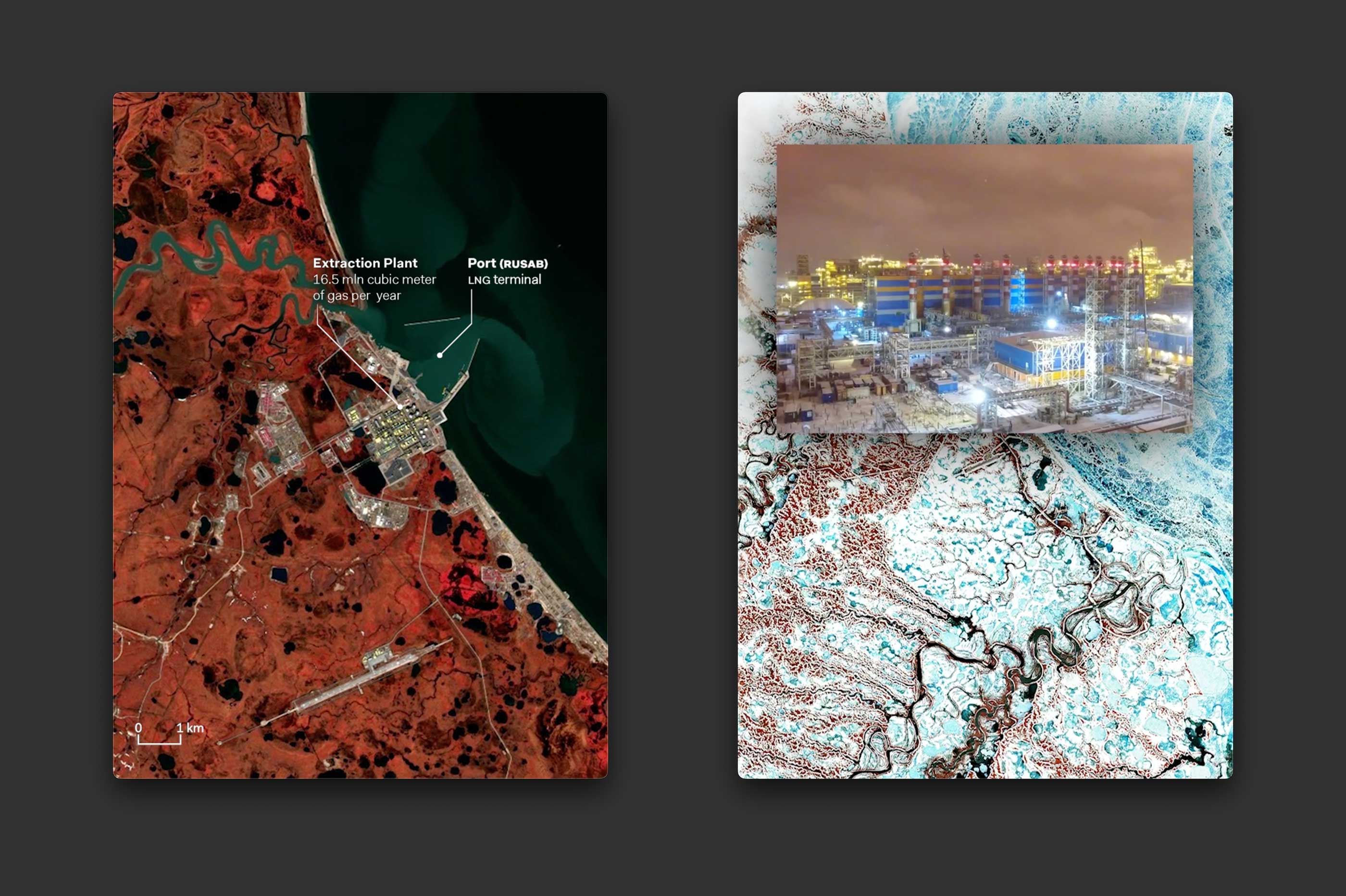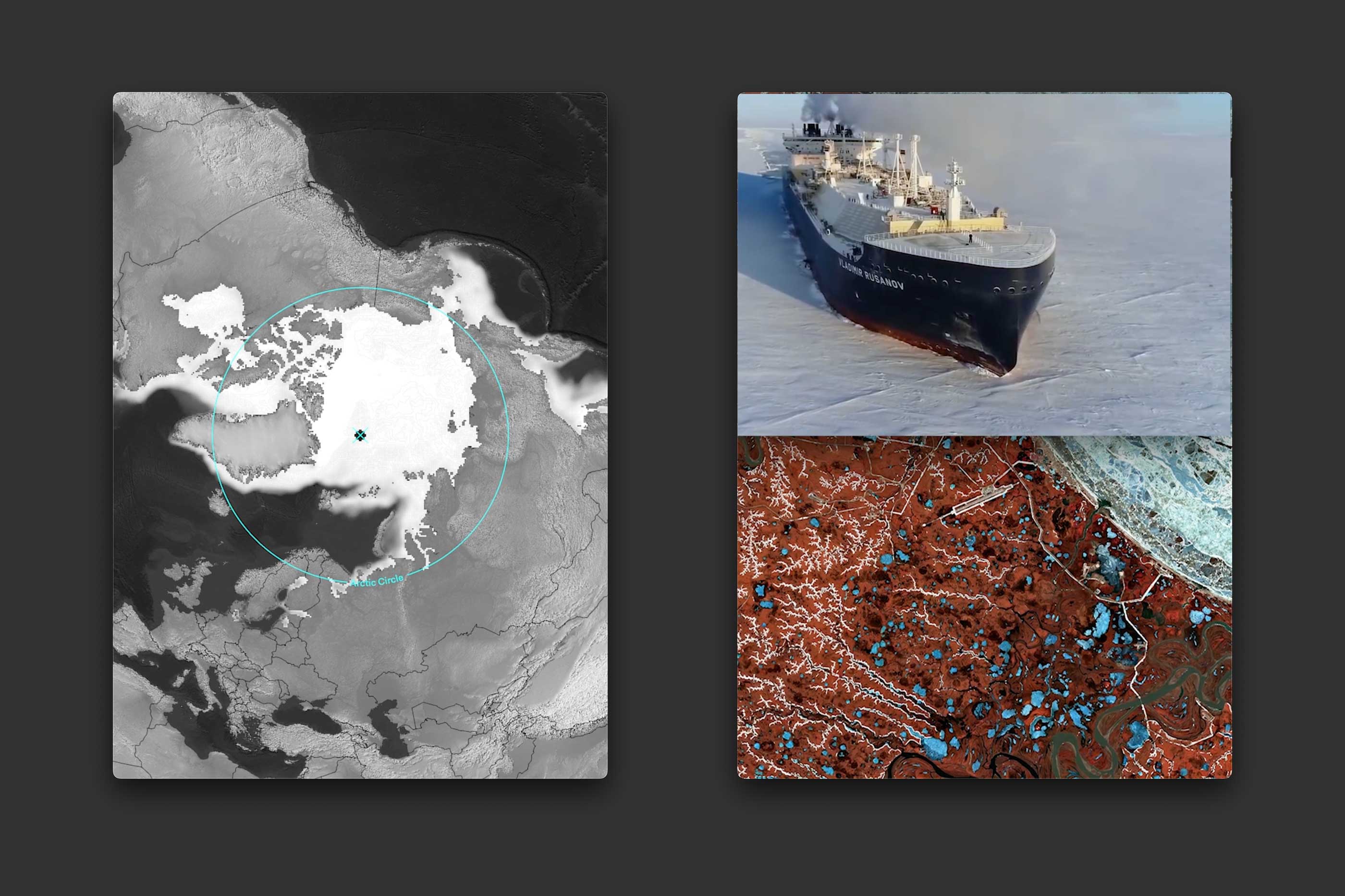 Climate Gains is an installation that quantifies the future carbon emissions linked to liquefied natural gas (LNG) shipments exported by Yamal LNG, a gas production facility located on the Russian Arctic coast. The project focuses on the shipping activity between June and August 2020, tracking cargo departures and destinations through a custom web scraper that collected and processed real-time maritime traffic data.