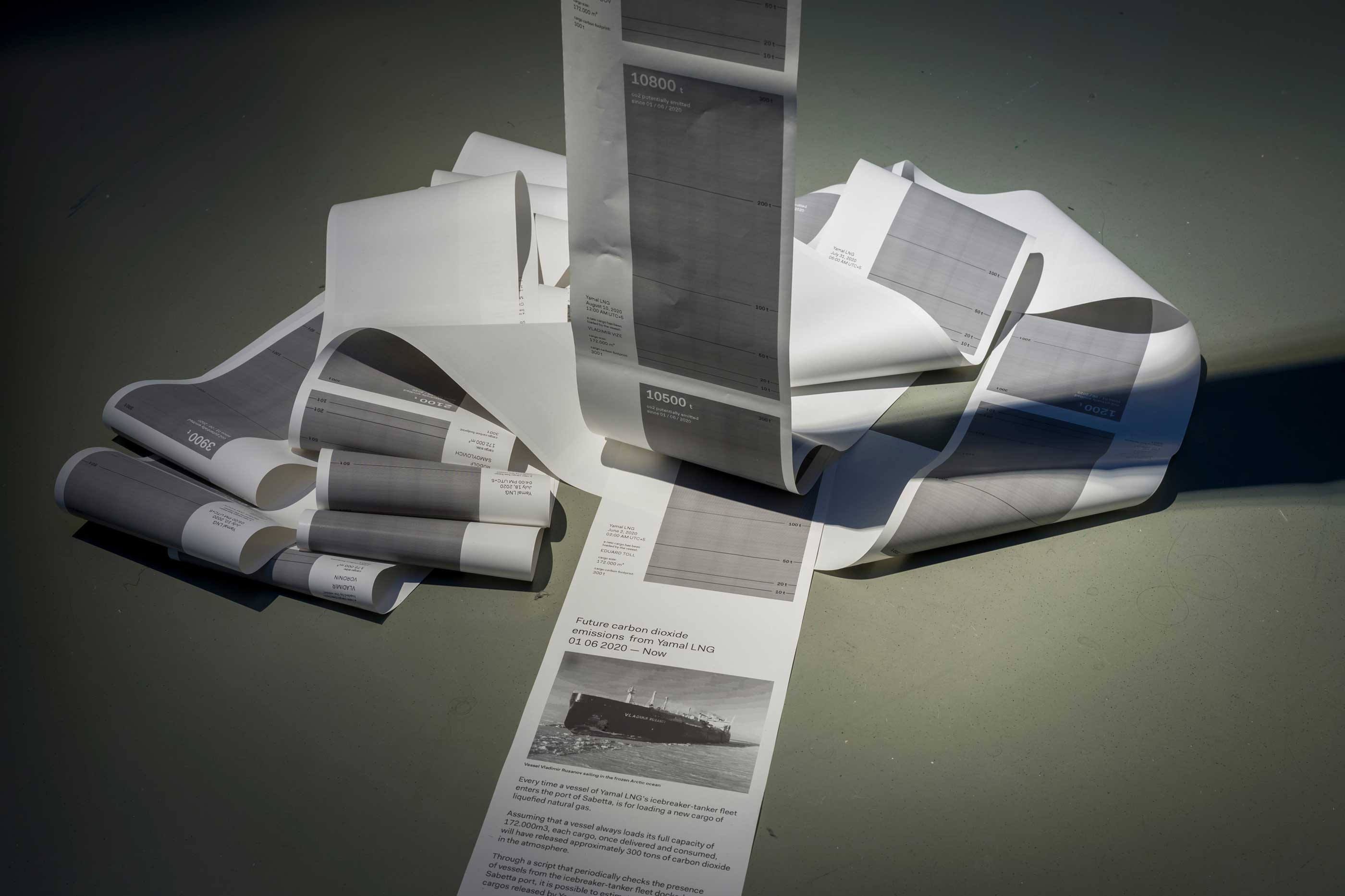 The resulting data was printed continuously using a thermal printer onto a single paper roll, forming a physical record of the emissions yet to be released—based on the assumption that all transported gas will eventually be combusted. Alongside this material output, the installation includes a video essay that contextualizes the dataset within a broader geopolitical and environmental narrative. The video addresses issues such as Arctic resource extraction, infrastructure development, and the global LNG market.