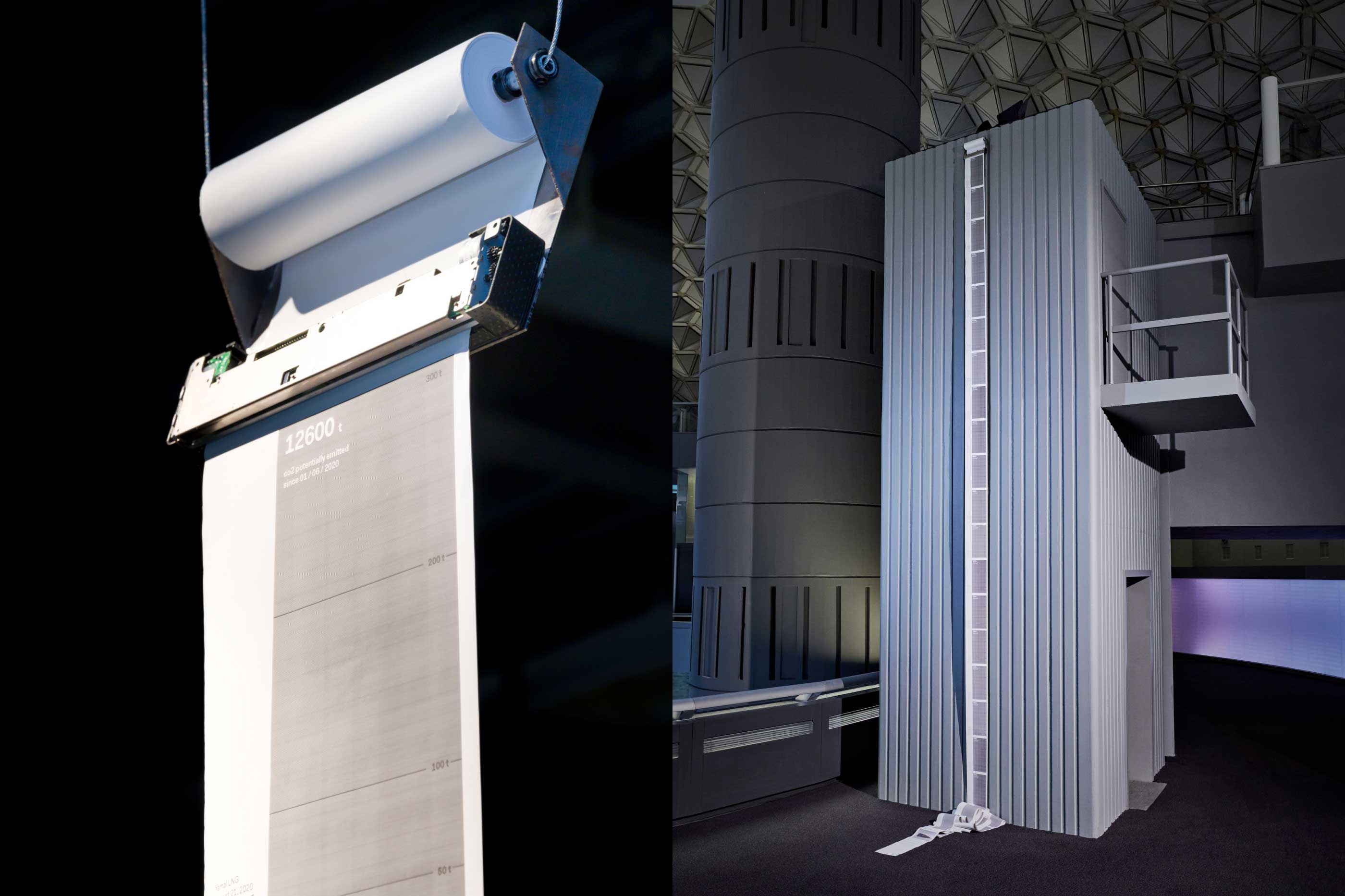 By using data as both content and form, the installation reconfigures statistical information into a time-based experience. The printed strip emphasizes duration and scale, contrasting the temporary visibility of cargo tracking with the long-term environmental effects of fossil fuel combustion. The combination of real-time scraping, physical output, and video documentation creates a layered reading of the topic—linking technical systems with their spatial and atmospheric consequences.